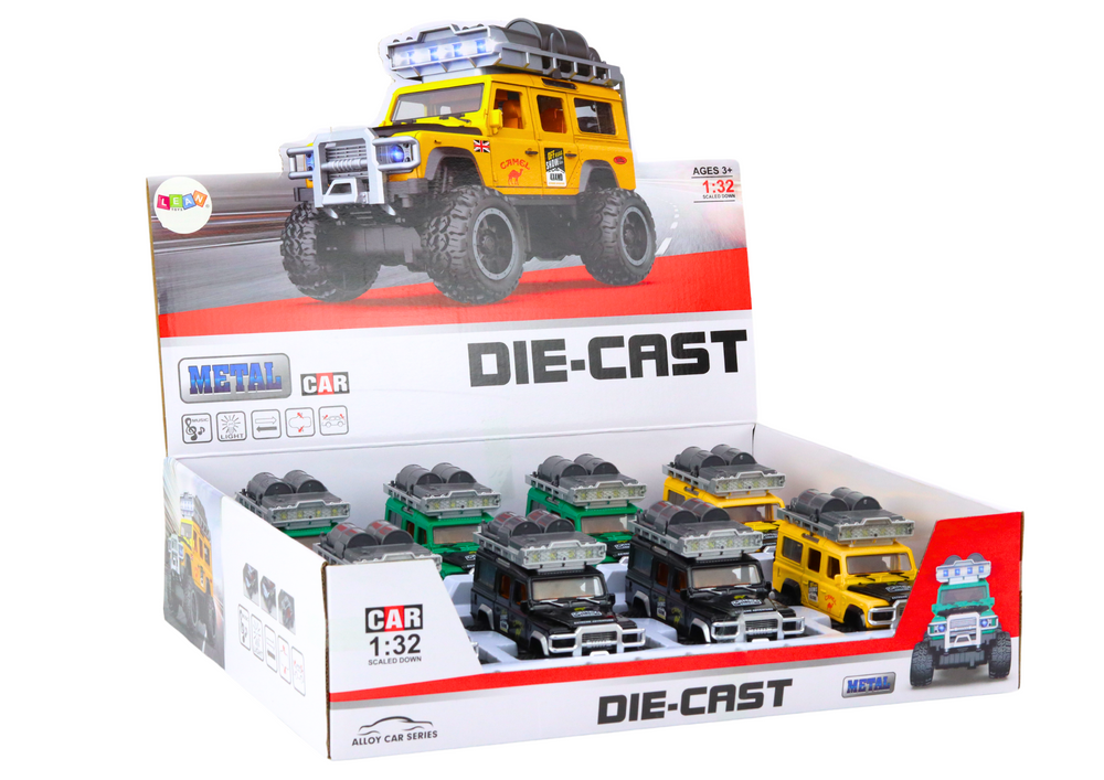 - 1:32 Geländewagen aus Metall mit solider Verarbeitung, Gummirädern, Stoßdämpfern, Licht und Sound. Der Friktionsantrieb sorgt für dynamisches Fahren. Es verfügt über zu öffnende Türen und einen Kofferraum, was dem Spiel Realismus und Interaktivität verlei