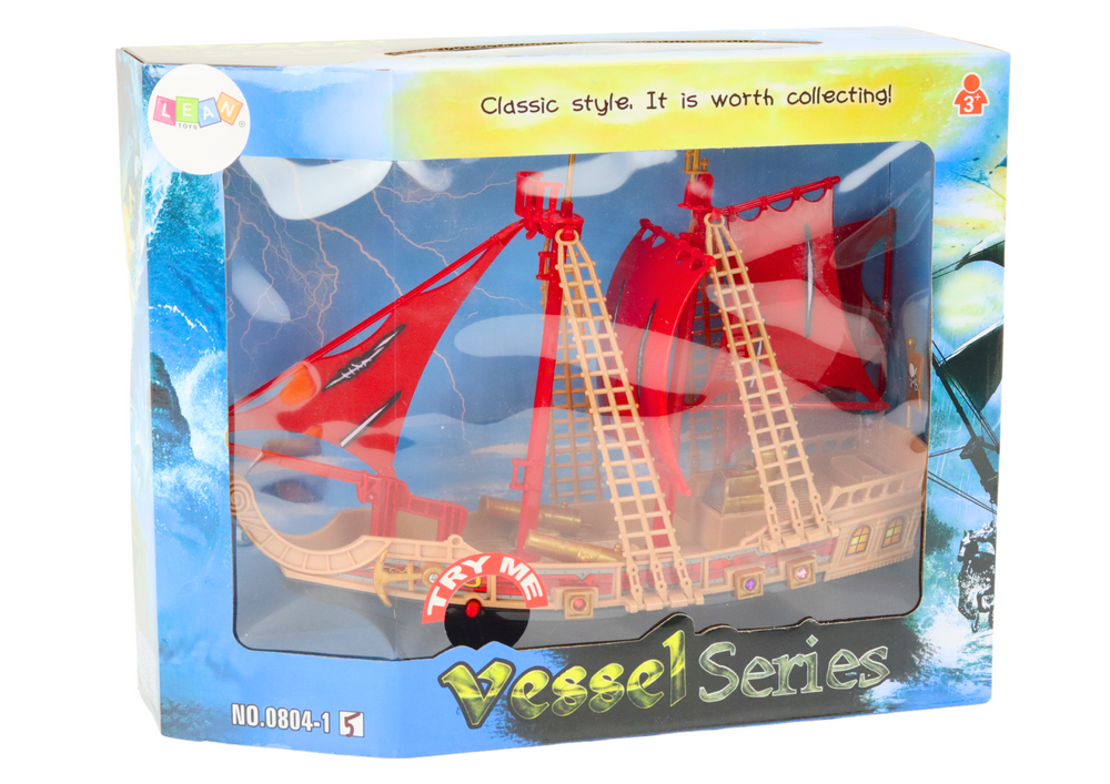 - Spielzeugpiratenschiff mit schwarzer Seite und roten Masten mit Piratenmarkierungen. Licht- und Soundeffekte lassen die Kanonen echt erscheinen. Die Räder erleichtern das Bewegen auf dem Boden und sorgen für stundenlangen, spannenden Spaß.