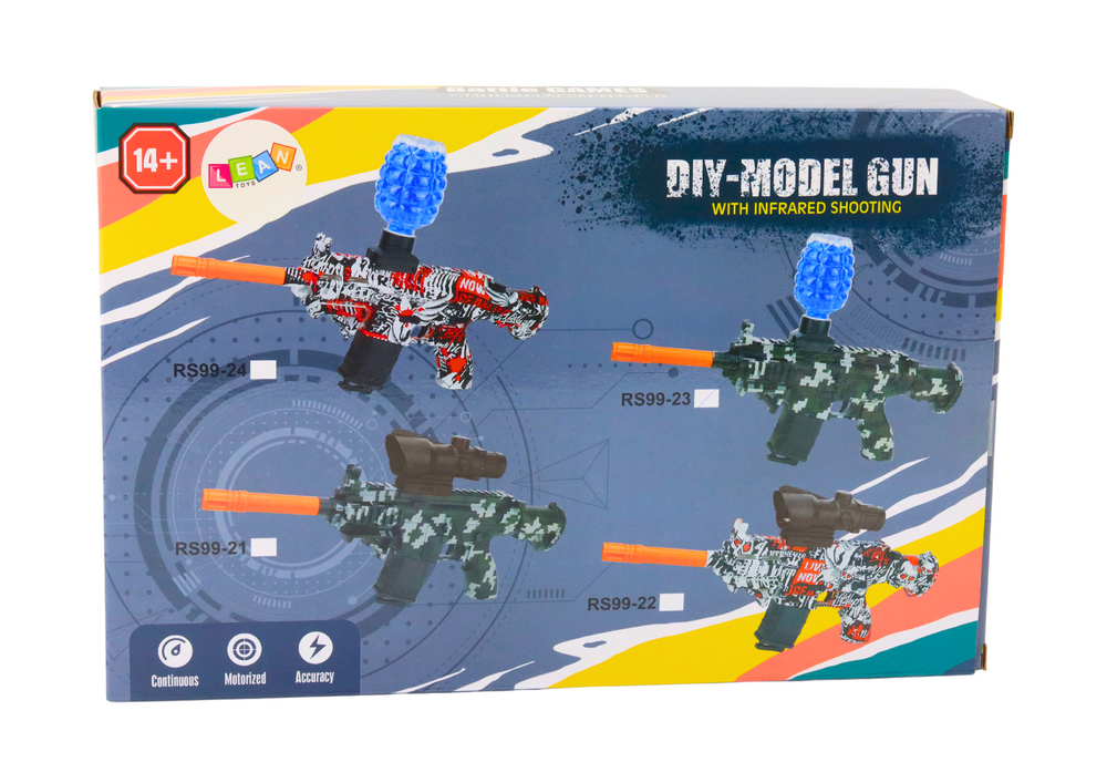 - Ein fortschrittliches Gewehr mit einem 600-Schuss-Magazin und einer Reichweite von bis zu 15 Metern. Unterstützt 7–8 mm große Kugeln. Bietet Automatik- und Einzelmodus. Das Set beinhaltet einen Gürtel, eine Schutzbrille, ein herausnehmbares Magazin und ei