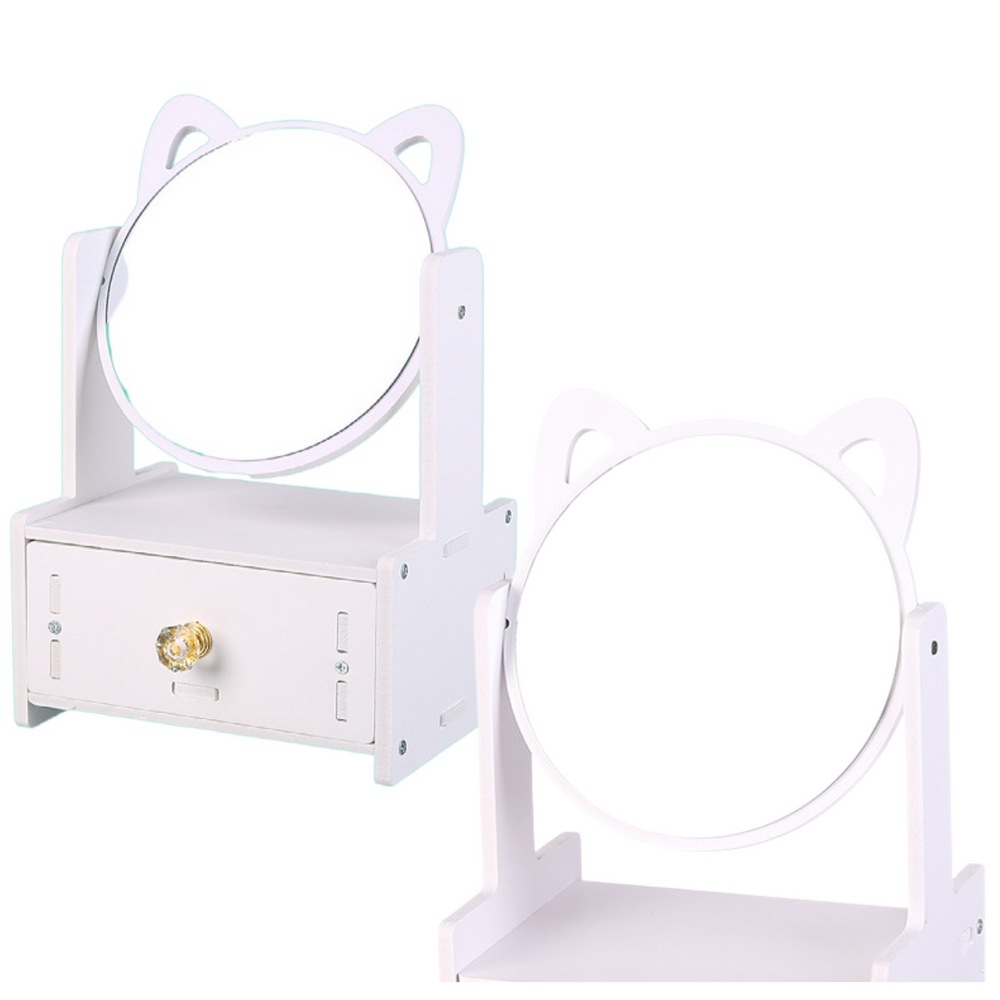 - Dieser Make-up-Spiegel kombiniert Eleganz und Funktionalität. Mit einer 360° drehbaren Konstruktion, einer integrierten Schublade für Kosmetika und dekorativen Ohren bietet er Stil und praktischen Nutzen für jeden Schminktisch. Maße: 25x16x13 cm.
