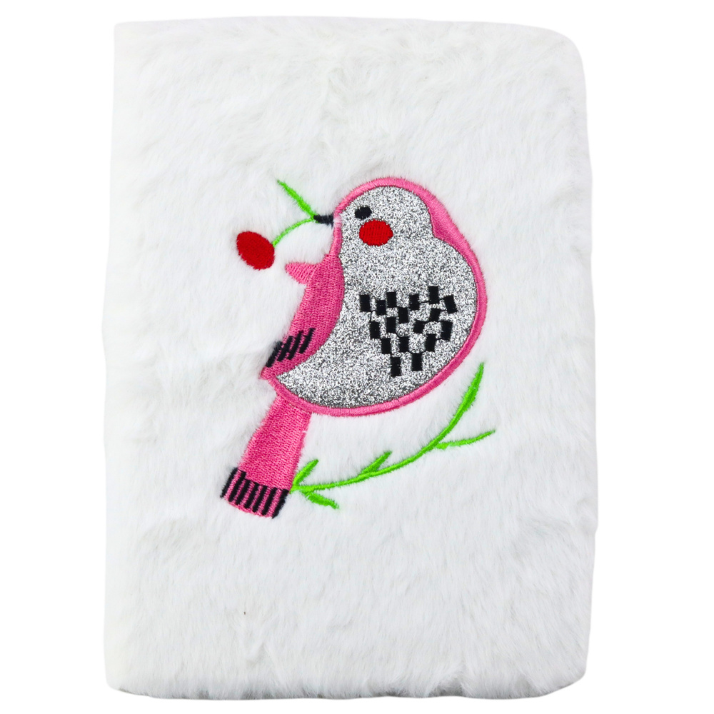 - Ein einzigartiges Notizbuch mit weichem Felleinband ist das perfekte Accessoire für Menschen, die Wert auf originelle und gemütliche Accessoires legen. Der weiße Einband ist mit einer gestickten Applikation in Form eines bezaubernden Vogels in Rosa und Si