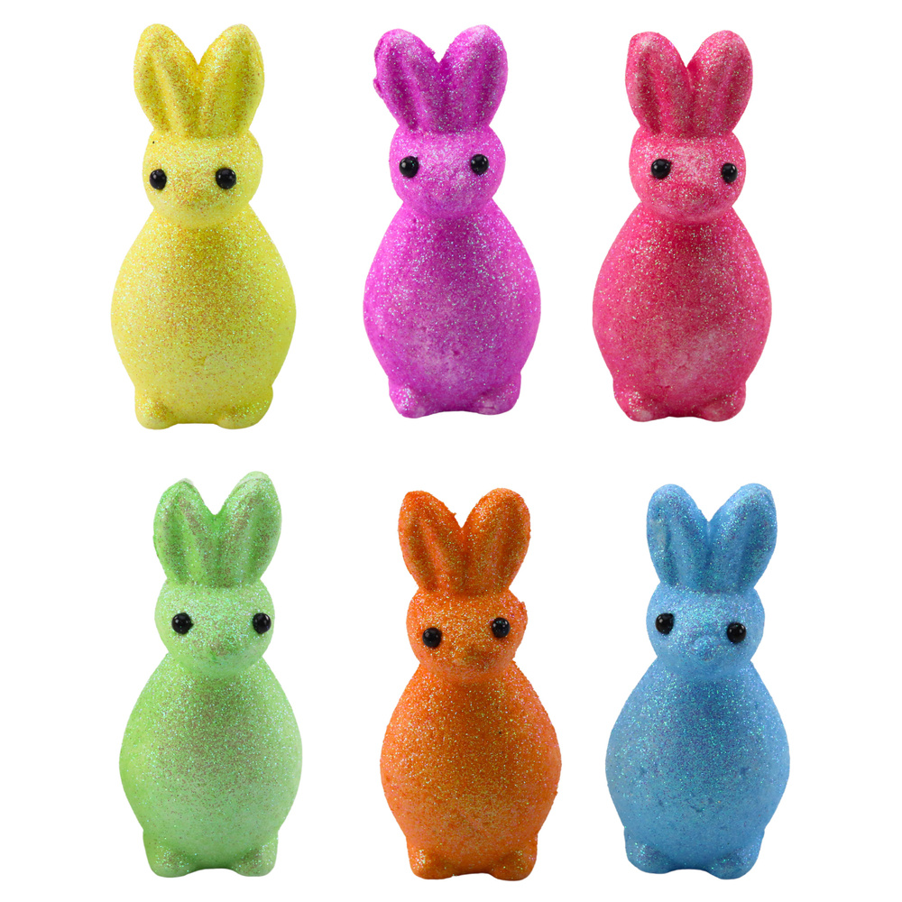 - Im Set sind 6 mit Glitzer überzogene Hasen enthalten, die durch ihre intensiven Farben alle Blicke auf sich ziehen. Die Hasen gibt es in sechs Farben, was sie zu einer perfekten Dekoration für Ostern macht
