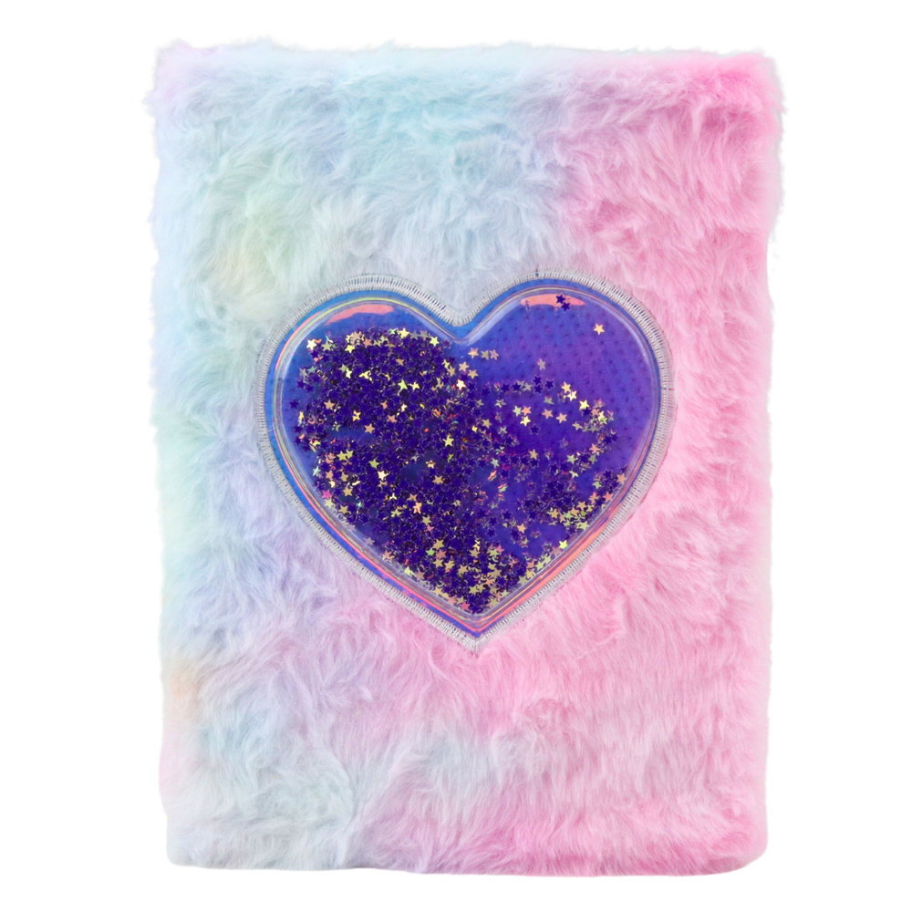 Der Einband ist mit mehrfarbigem, pastellfarbenem Plüsch bezogen und hebt sich so von anderen Schreibwaren ab. In der Mitte befindet sich ein dekoratives Herz mit glitzerndem, sternförmigem Konfetti, das sich beim Bewegen des Notizbuchs frei bewegt – ein auffälliges Merkmal, das das Notizbuch einzigartig macht.