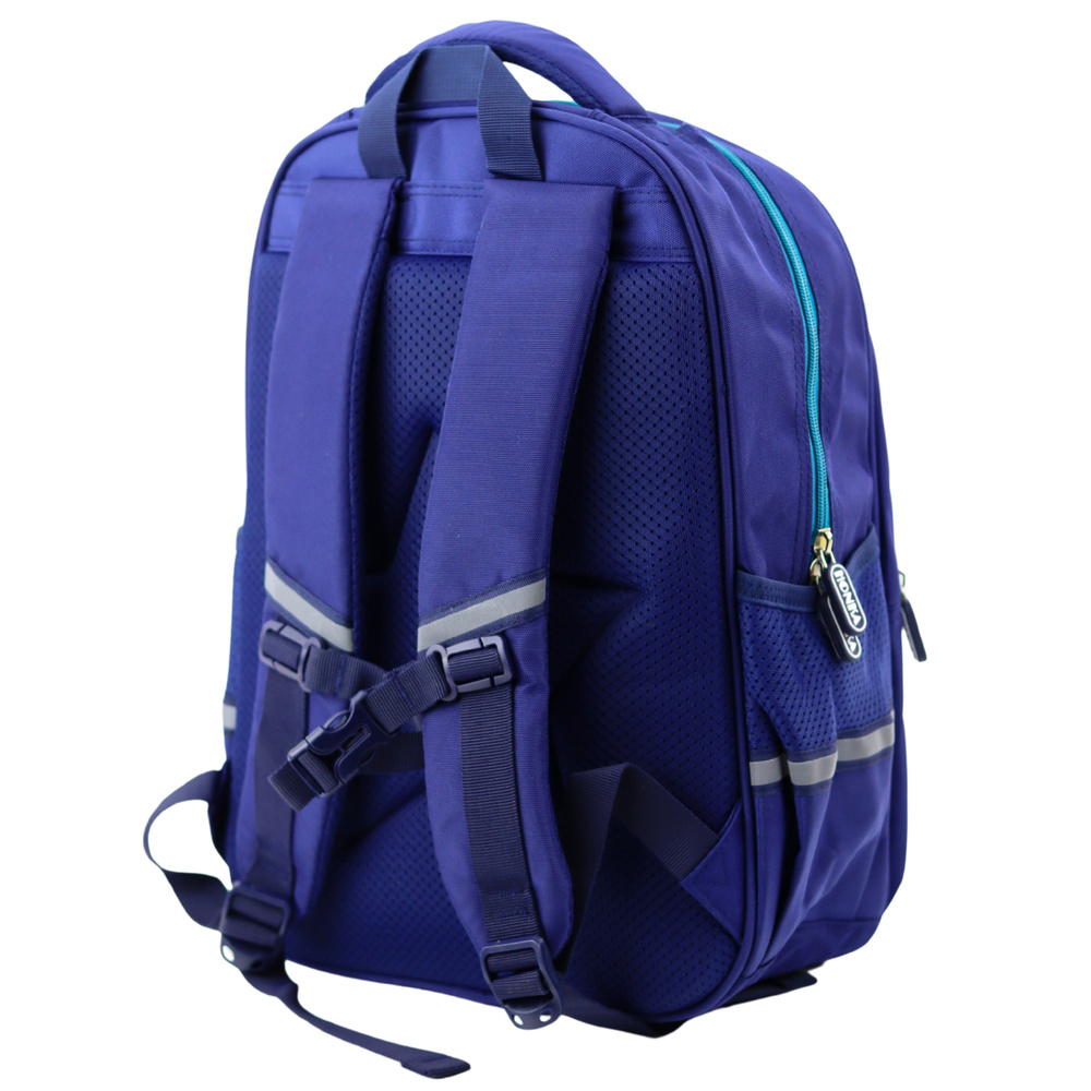 Der Rucksack verfügt über ein geräumiges Hauptfach mit einer Innenaufteilung, die eine geordnete Aufbewahrung von Büchern und Heften ermöglicht. Außerdem stehen dem Kind zur Verfügung: ein zweites kleineres Fach, eine Vordertasche mit Reißverschluss und eine kleine Tasche mit Klettverschlussklappe. Auf beiden Seiten des Rucksacks befinden sich Netztaschen, perfekt für eine Flasche oder einen Flachmann.