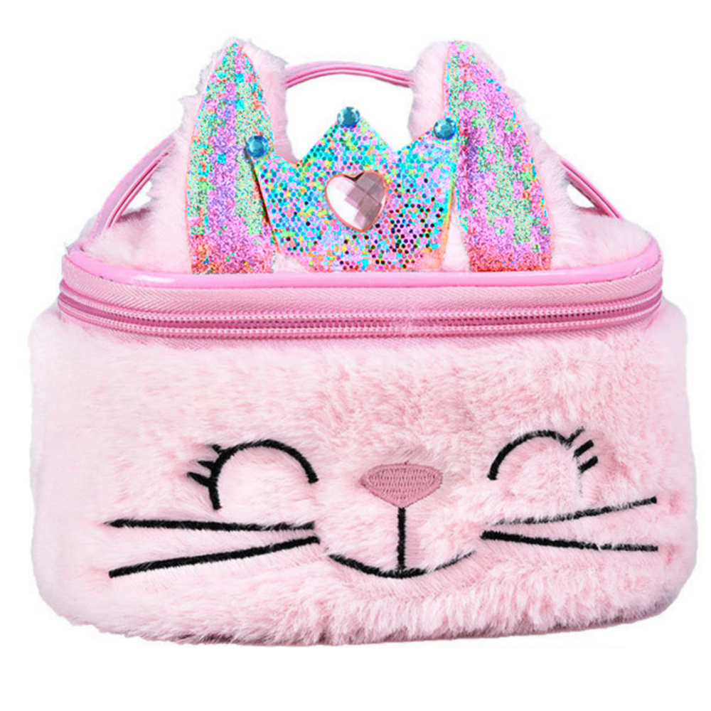- Eine bezaubernde Kinderkosmetiktasche mit Hasenmotiv ist die perfekte Wahl für alle kleinen Liebhaber von Tieren und märchenhaften Accessoires. Weiches, flauschiges rosa Material, Glitzerohren und eine Tiara-Krone mit Herz