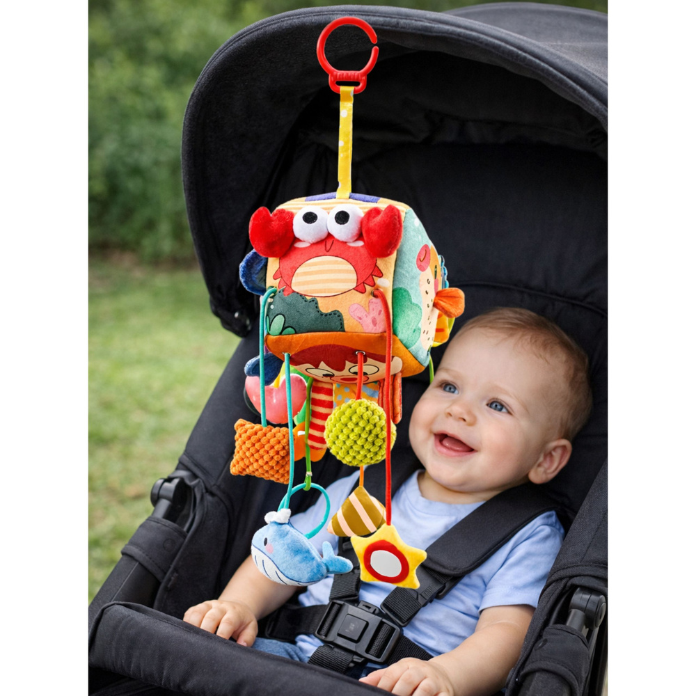 Der Würfel ist mit einem praktischen Anhänger ausgestattet, der einfach an einem Autositz, Kinderwagen, einer Babywippe oder einem Kinderbett befestigt werden kann, sodass das Spielzeug das Kind sowohl zu Hause als auch auf Reisen begleiten kann.