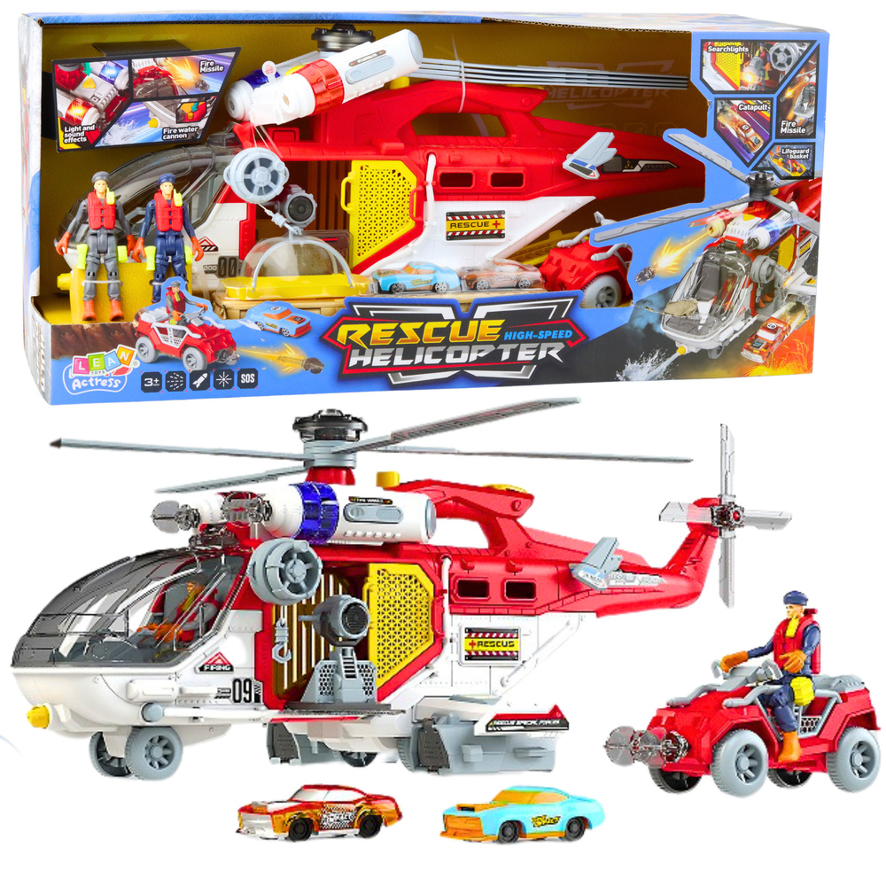 - Multifunktionaler Hubschrauber: Ausgestattet mit Lichtern, Geräuschen, Seilwinde, Fahrzeugrampe und zu öffnendem Rumpf, Autoschießen