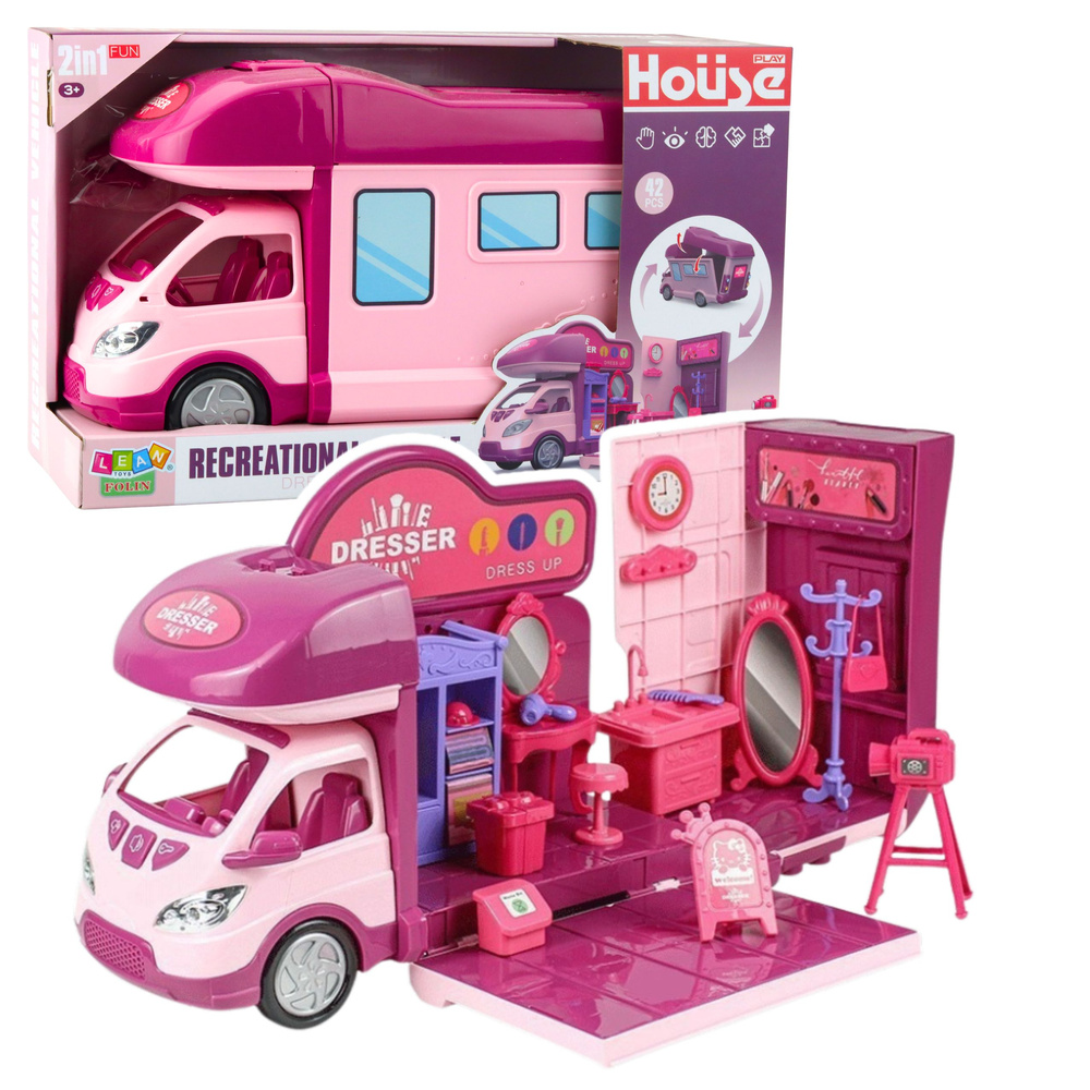 - Der faltbare Traumcamper ist ein einzigartiges Spielzeug, das Kinder in eine Welt voller Reisen, Abenteuer und kreativem Spielen entführt. Das große, rosa und lilafarbene Fahrzeug lässt sich aufklappen und in ein reich ausgestattetes Puppenhaus verwandeln