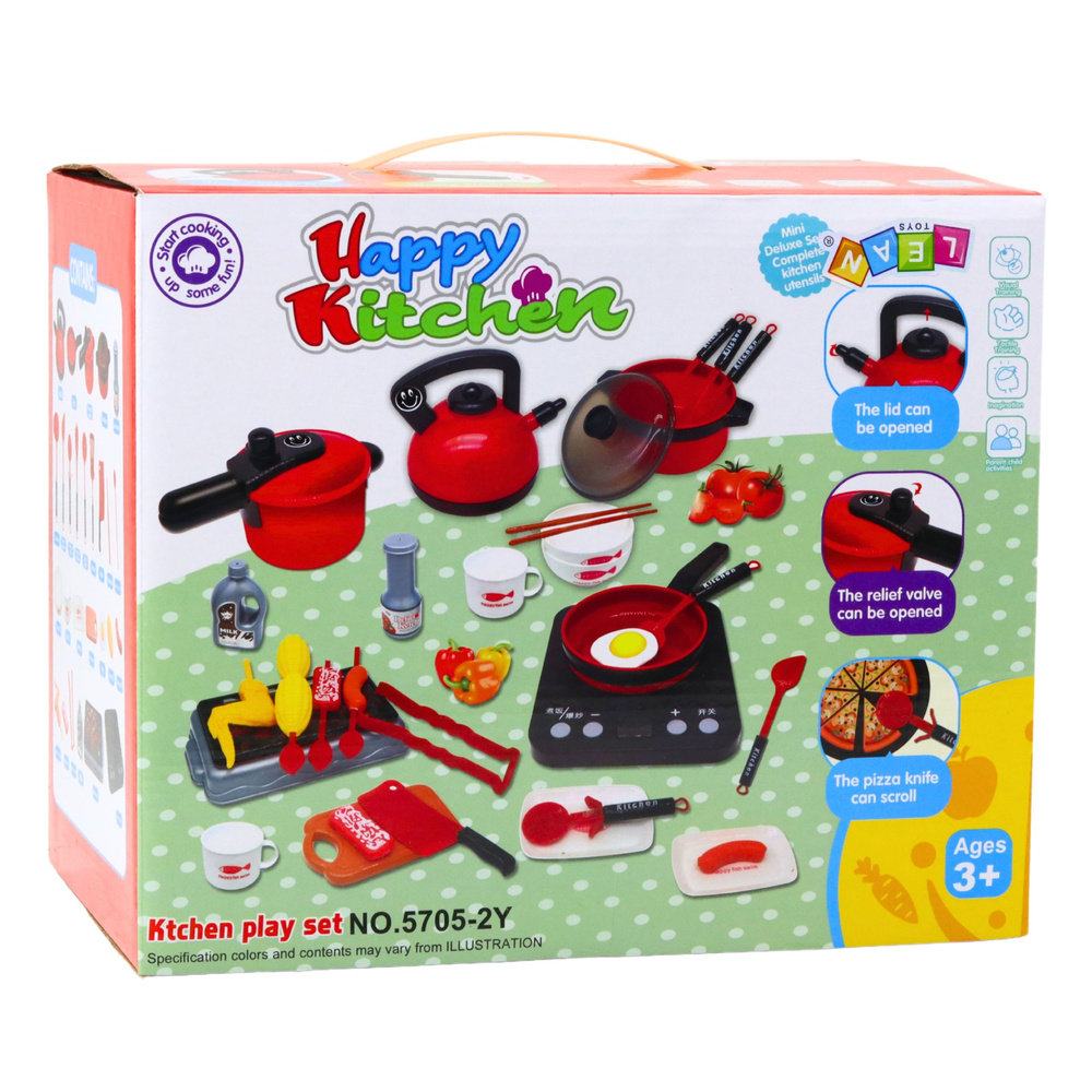 Das Küchenset zum Kochen ist ein einzigartiges Angebot für Kinder, die gerne in die Rolle eines Kochs schlüpfen. Das Set enthält 36 Elemente, die echtes Geschirr, Küchenutensilien und Zutaten imitieren. Darunter finden sich unter anderem ein Wasserkocher, eine Bratpfanne, ein Schnellkochtopf, ein Topf mit Deckel, ein Grill, ein Schneidebrett, Sushi-Stäbchen und eine bewegliche Kochplatte mit Brat- und Kochgeräuschen. Alles ist mit Liebe zum Detail und in attraktiven Rot-Schwarz-Farben gestaltet.