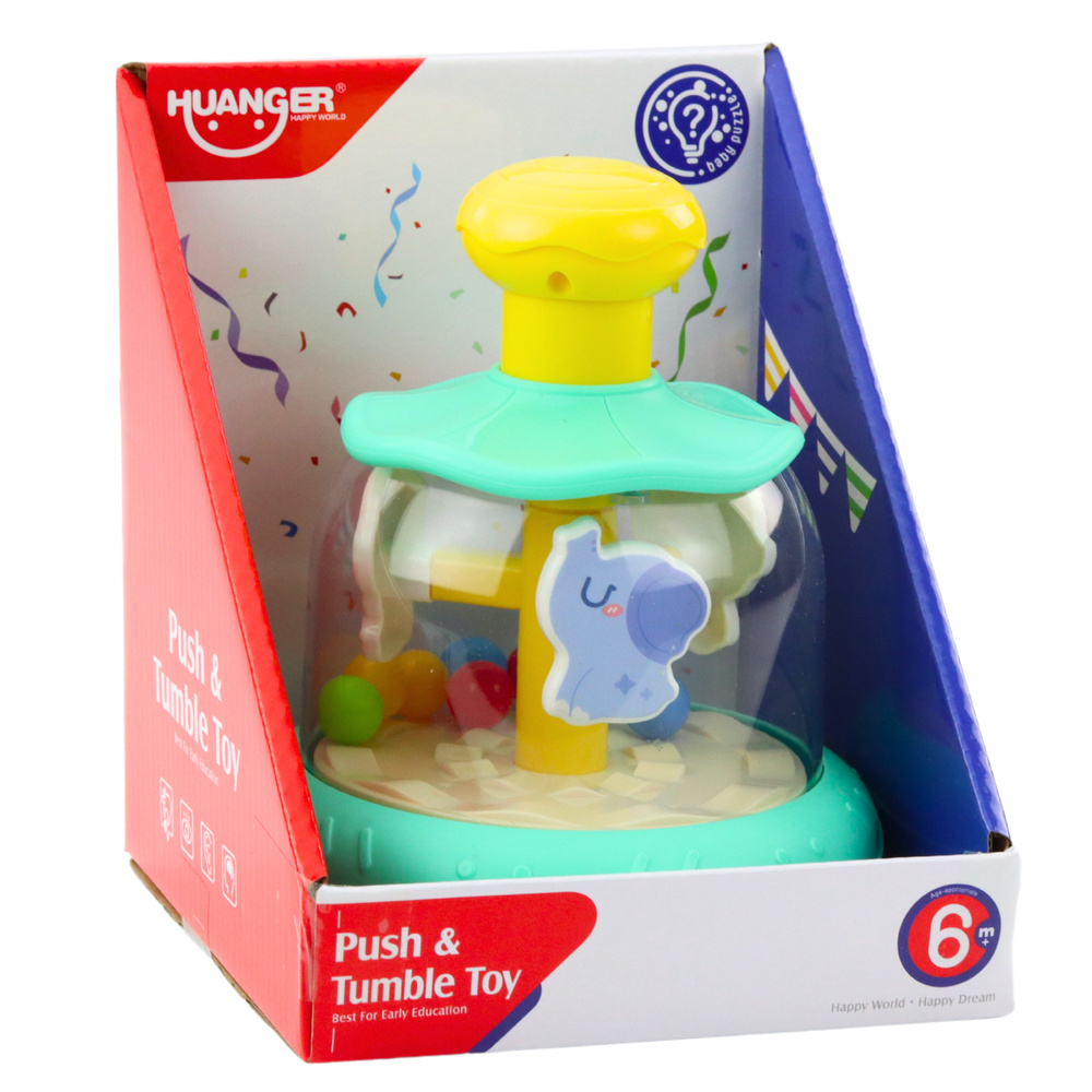 Nach dem Drücken des gelben Knopfes an der Oberseite wird der Kreisel in Bewegung gesetzt und die Tiere beginnen, sich um die eigene Achse zu drehen, wodurch ein dynamisches, buntes Karussell entsteht. Das Spielzeug fördert das Seh- und Hörvermögen sowie die Bewegungsfähigkeit des Kindes und entwickelt gleichzeitig die Hand-Augen-Koordination und das Verständnis von Ursache-Wirkungs-Beziehungen.