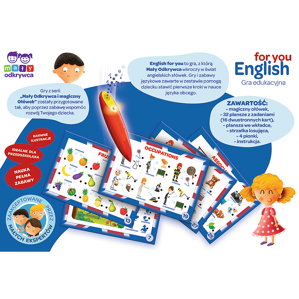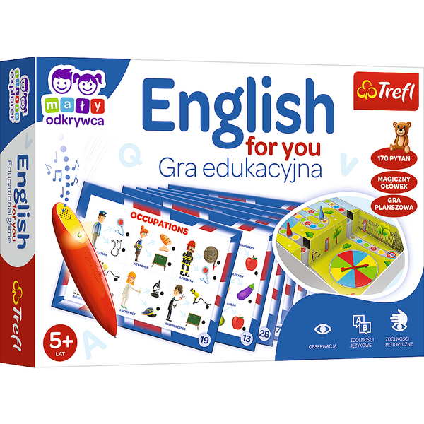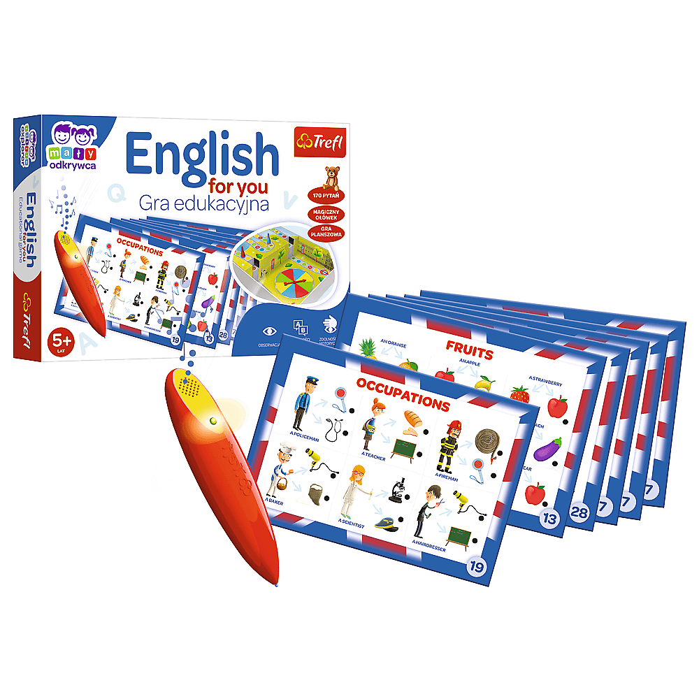 Trefl English for You – Lernspiel „Little Explorer“ und „Magic Pencil“ für Kinder ab 5 Jahren. „English for You“ ist ein Lernspiel für Kinder, mit dem kleine Entdecker den grundlegenden englischen Wortschatz erlernen. Schnapp dir deinen Zauberstift und begib dich auf eine sprachliche Reise! Lernen Sie die Namen von Berufen, Ihre Lieblingsfrüchte und die Namen der Räume in Ihrem Haus! Eine liebevoll illustrierte Ausgabe, eine Tafel mit Zufallsgenerator und spannende Aufgabenvorschläge sind das Rezept für gelungenen Spielspaß. „English for You“ ist eine Kombination aus Brettspiel und Quiz. Sie lernen, wie Sie Englisch in natürlichen Lebenssituationen verwenden. Machen Sie mit und kommunizieren Sie mit Menschen auf der ganzen Welt! Die Magic Pencil-Reihe wurde entwickelt, um Kinder noch stärker in den spielerischen Lernprozess einzubinden. Der Magic Pencil gibt ein Ton- und Lichtsignal ab, wenn Sie die richtige Antwort auf der Bildaufgabenkarte markieren. Funktionen des Spiels: • Pädagogisches Familienspiel • Lernen durch Spielen • Einfache Regeln • Ideal für Kinder ab 5 Jahren • Pädagogische Hilfe im Kindergarten und in der 1. bis 3. Klasse Das Spiel entwickelt: • Englischkenntnisse • Kommunikationsfähigkeit • Wahrnehmung und Auge-Hand-Koordination • Logisches Denken • Gedächtnis und Konzentration • Vorstellungskraft und Kreativität Sprachspiele und Aktivitäten unterstützen Kinder bei ihren ersten Schritten beim Erlernen einer Fremdsprache. Das Set wurde entwickelt, um die kognitive und intellektuelle Entwicklung des Kindes zu unterstützen: Es fördert das Erlernen des Wortschatzes und entwickelt Kommunikationsfähigkeiten in Form eines freudigen Spiels. „English for You“ ist das perfekte Spiel für jedes Kleinkind, um sein Abenteuer mit der englischen Sprache zu beginnen! Entdecken Sie Trefl Games und teilen Sie die Freude am Spielen. Brettspiele sind ein tolles Geschenk zum Geburtstag, Kindertag oder Weihnachten. Sie eignen sich perfekt für gesellige Zusammenkünfte und schöne Momente mit der Familie. Inhalt der Box: • 32 Aufgabentafeln (16 doppelseitige Karten) • Zauberstift • 4 Spielfiguren • Anleitung mit Spielvorschlägen • Brett Maße der Box: 330x227x55 Anzahl Spieler: 1-4 Durchschnittliche Spieldauer: 10-25 min Alter: 5+