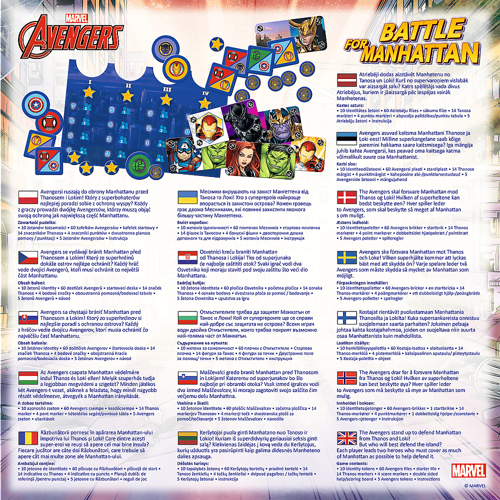 Jeder Spielteilnehmer erhält heimlich einen Spielstein mit den Symbolen zweier Avengers. Die Aufgabe der Spieler besteht darin, möglichst viel von Manhattan unter die Kontrolle ihrer gezeichneten Helden zu bringen. Es erwartet Sie ein spannendes Gameplay voller Geheimnisse und Strategien, um die Stadt sicher zu halten!