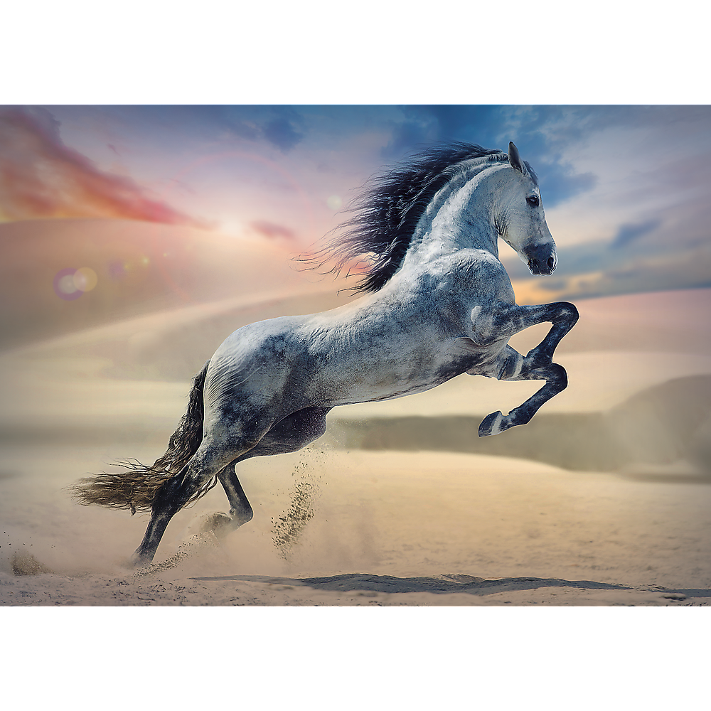 Das aus 1.000 Teilen bestehende Puzzle „Majestic Horse“ zeigt ein durch die Wüste rennendes Tier mit der untergehenden Sonne im Hintergrund. Nach der Anordnung entsteht ein Bild im Format 683x480 mm.