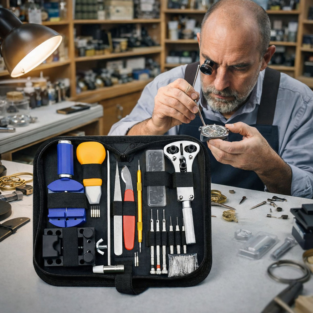 - Das professionelle Uhrenreparaturset ist ein komplettes Set an Werkzeugen, das für die präzise Bedienung, Reparatur und Wartung von mechanischen und Quarzuhren entwickelt wurde.