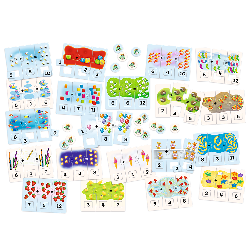 Addition ist ein pädagogisches Puzzle für Vorschulkinder, das Kindern auf freundliche Weise die Welt der Addition näherbringt. Kleinkinder lernen spielerisch, Zahlen zu erkennen und bis 12 zu addieren. Das Spiel entwickelt das Gedächtnis, regt mathematische Fähigkeiten und die Beobachtungsgabe an. Es ist eine großartige Möglichkeit, das Lernen mit dem Spaß am Entdecken der Additionsregeln zu verbinden!