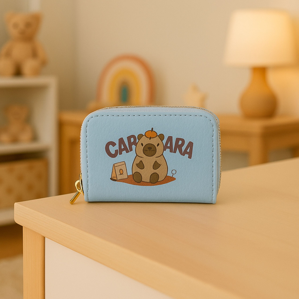 Blaue Geldbörse mit Capybara-Motiv und zwei Fächern für Karten und Bargeld