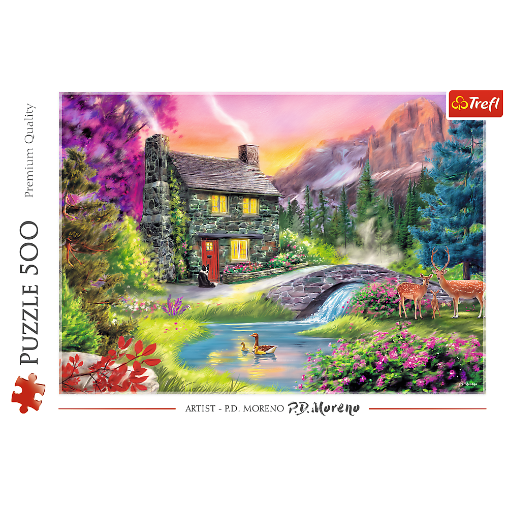 Bergidylle von Trefl ist ein 500-teiliges Puzzle, das dich in eine magische, malerische Berglandschaft entführt. Das Kunstwerk von P.D. Moreno zeigt ein charmantes Steinhaus, umgeben von einem blühenden Garten, einem ruhigen See und wilden Tieren. Lebendige Farben und außergewöhnliche Detailgenauigkeit machen das Puzzeln zu einem wahren Vergnügen und zur idealen Entspannung. Perfekt für Naturliebhaber und gemütliche Abende mit Puzzeln.