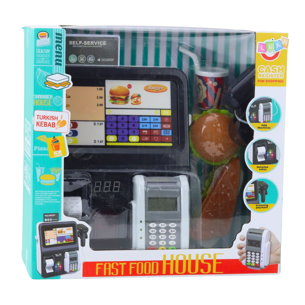 - Die Kasse des Fast-Food-Restaurants ist ein interaktives Set für Kinder, die gerne Kaufladen, Restaurant oder Kundenservice spielen. Sie zeichnet sich durch ein realistisches Design, einen großen Bildschirm mit farbenfrohen Produktsymbolen und eine große