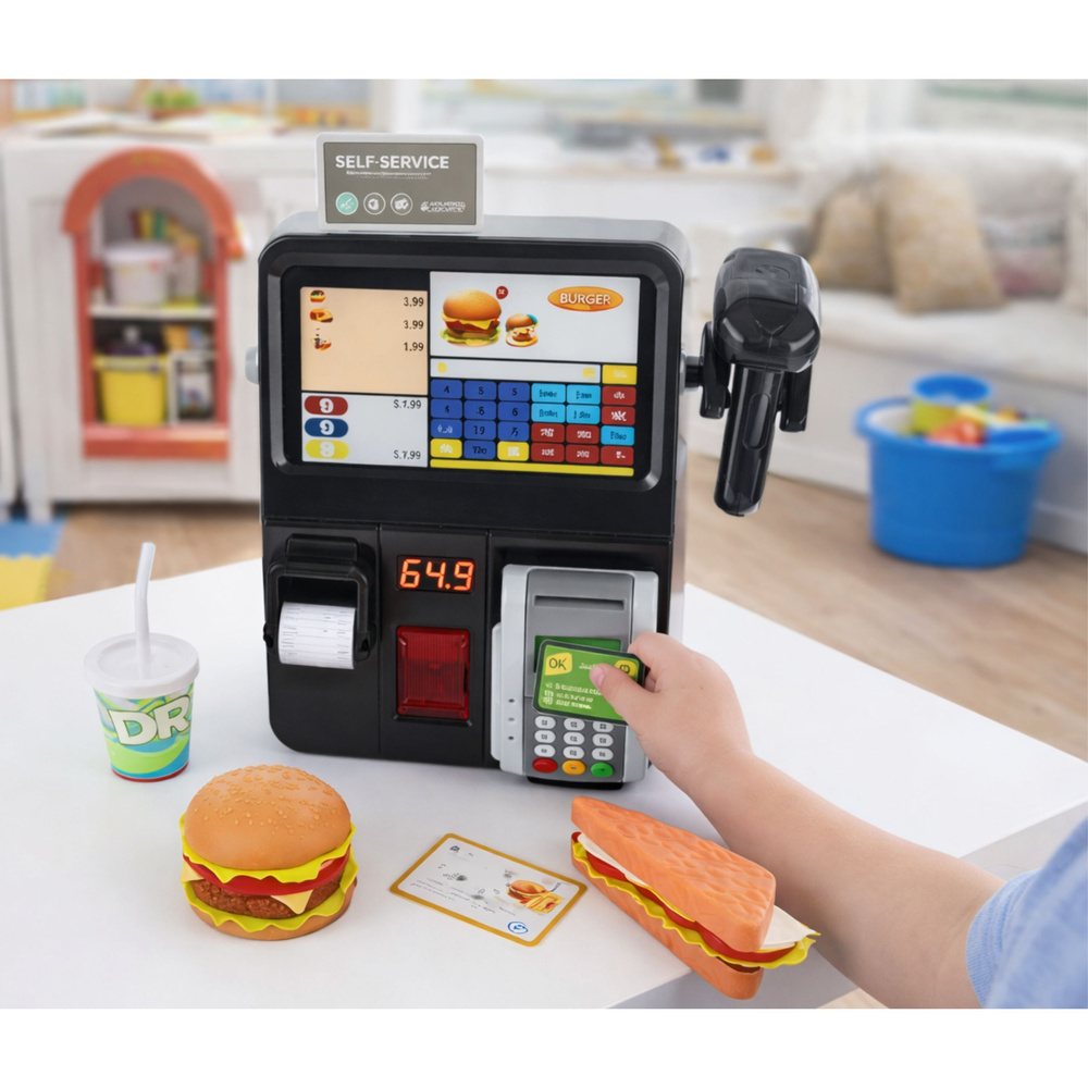 Kinder können Produkte scannen, Quittungen ausstellen, das Zahlungsterminal nutzen und realistische Verkäufertätigkeiten ausführen. Das Set enthält eine Kasse, ein Kassenterminal, einen Scanner und verschiedene Lebensmittel-Elemente und ist somit perfekt für Fast-Food-Spiele.