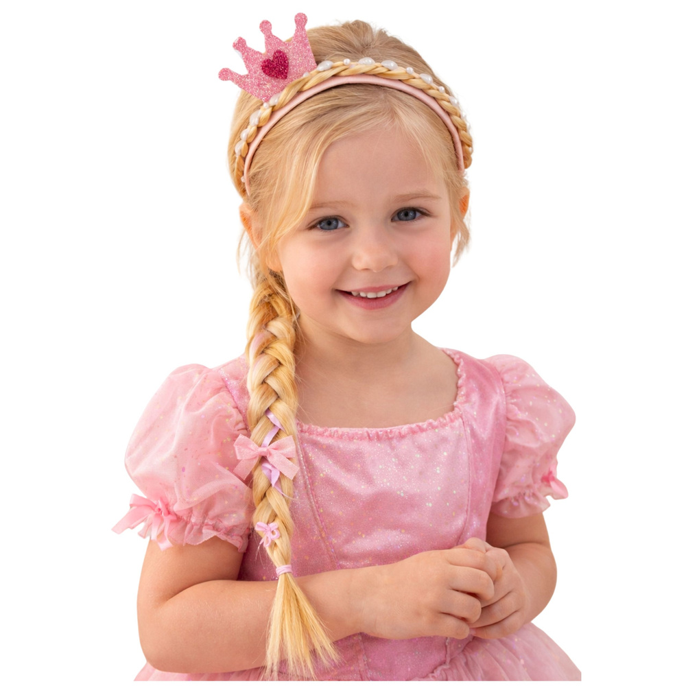 - Dieses elegante Haarband mit langem, prinzessinnenhaftem Zopf ist ein einzigartiges Accessoire für Kinder, die von märchenhaften Looks und Verkleidungsspaß träumen. Das Haarband ist mit einer kleinen, funkelnden Prinzessinnenkrone verziert.