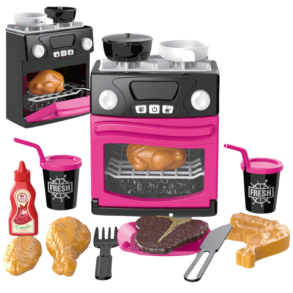 Der Backofen lässt sich öffnen, sodass Kinder Spielzeuglebensmittel wie Hähnchen oder Steak hineinlegen können. So können sie unzählige Szenen gestalten und ihre Fantasie und Feinmotorik entwickeln. Brenner und Küchenutensilien befinden sich auf dem Herd und sorgen für noch mehr Realismus.