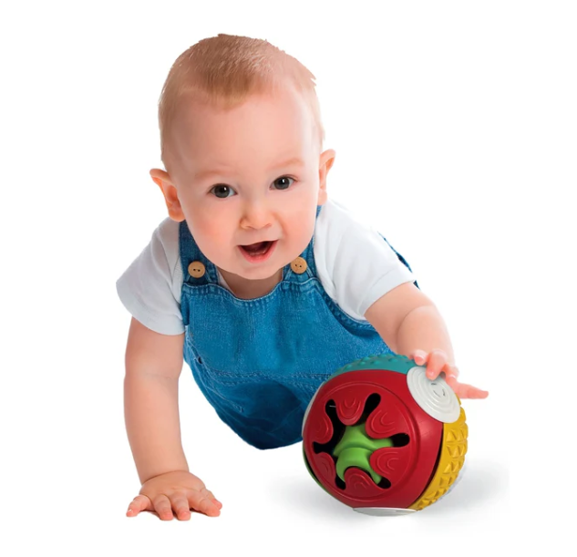 Der Ball ist in 4 farbige Segmente unterteilt, jedes mit einer anderen Oberflächenstruktur, um den Tastsinn und Sehsinn von Kleinkindern zu fördern.