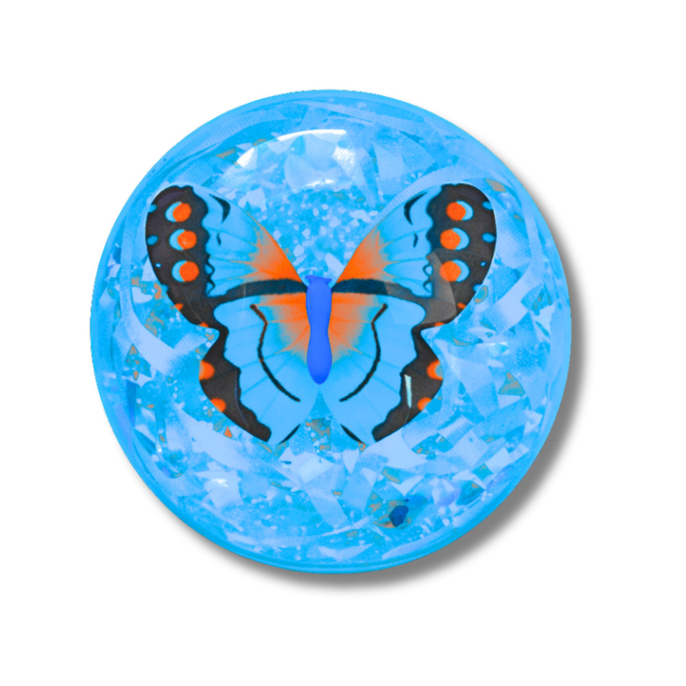 - Der flexible Ball mit funkelndem Konfetti und einem dekorativen Schmetterling im Inneren ist ein auffälliges und dynamisches Spielzeug, das mit seinen intensiven Farben und seinem einzigartigen Inneren Aufmerksamkeit erregt.