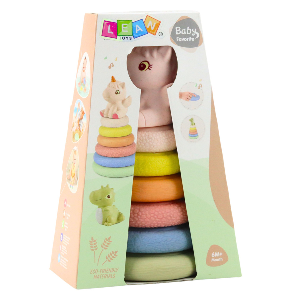 Das Set besteht aus sechs weichen Kreisen aus umweltfreundlichen Materialien mit jeweils unterschiedlicher Struktur und Textur. Die verschiedenen Texturen bieten Kindern vielfältige taktile Reize und regen den Tastsinn und die kognitive Neugier an. Das Stapeln der Teile fördert die Feinmotorik, die Hand-Augen-Koordination und das logische Denken. Ein besonderes Highlight ist das Einhorn an der Spitze der Pyramide, das beim Drücken ein quietschendes Geräusch erzeugt und so zur Interaktion anregt.
