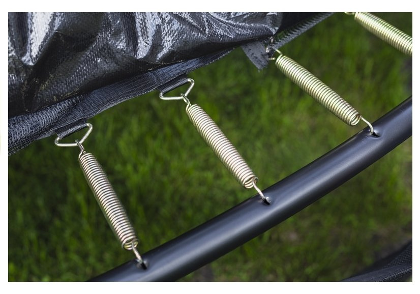 - Sprungmatte (aus Polypropylen), Sicherheitsnetz (aus Polyethylen) und Randabdeckung (aus PVC),