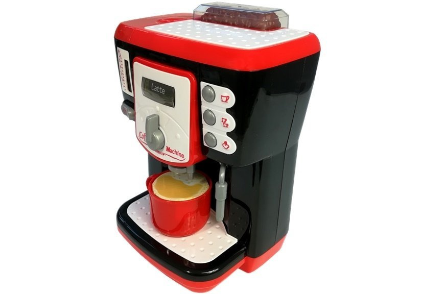 Die schwarz-rote Kaffeemaschine ist ein wirklich interessantes Spielzeug. Im Aussehen ist er wie moderne Automaten gestylt, wodurch er neben seinem Original auch in der Küche kühn stehen kann. Das Spielzeug ist mit einem Drehknopf zum Umschalten der zubereiteten Kaffeesorten - Cappuccino, Latte und Macchiato - ausgestattet. Auf der linken Seite des Gerätes befindet sich ein Tank, der beim Umschalten des Knopfes Wasser aus dem Spender fließen lässt! Auf der rechten Seite befinden sich Tasten, die verschiedene Betriebsarten der Kaffeemaschine simulieren. Das Set ist außerdem mit einer Kaffeebohnen-Imitation im Tank und einer Tasse ausgestattet, die von der Kaffeemaschine befüllt werden kann.