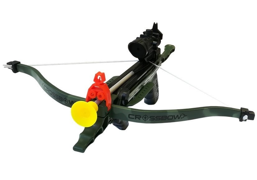 Zaawansowana konstrukcja naszej Kuszy sprawia, że inne wersje kuszy sklecone z dwóch kawałków drewna pójdą w odstawkę. Główny trzon broni wykonany jest z wysokiej jakości plastiku w kolorze ciemnozielonym - uzyskuje przez to wojskowy charakter. Kusza wyposażona jest w celownik optyczny, a także laserowy - po uruchomieniu czerwona kropeczka wskazuje miejsce, w które celujemy. Najciekawszą funkcją tej zabawkowej kuszy jest półautomatyczny naciąg. Twoje dziecko nie musi się już siłować próbując naciągnąć cięciwę - wykorzystując dźwignię umieszczoną w tylnej części korpusu kuszy linka zostanie automatycznie naciągnięta na gotową pozycję.
