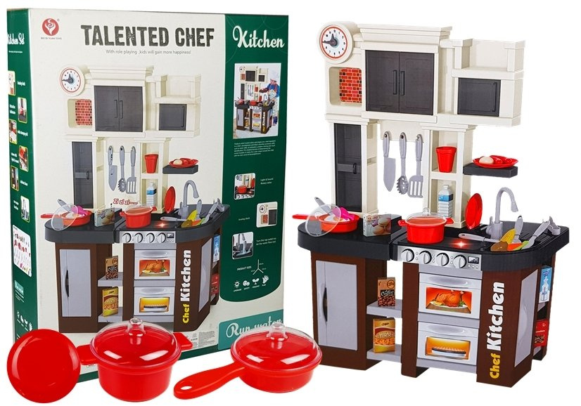- Diese große interaktive Küche ist eine einzigartige Option für Kinder, die gerne kochen und davon träumen, ein echter Koch zu sein. Ausgestattet mit fließendem Leitungswasser, glühenden Brennern, realistischen Koch- und Bratgeräuschen und Zubehör.