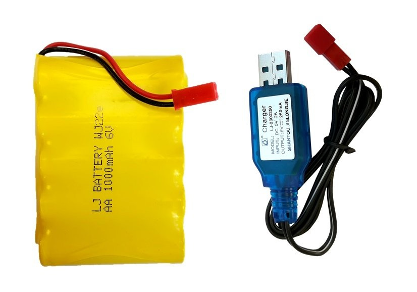Das ferngesteuerte Geländewagen mit Allradantrieb wird von einer 6-V-Batterie gespeist, die über das mitgelieferte USB-Kabel aufgeladen wird. Für den Betrieb der Fernbedienung sind 2 AA-Batterien erforderlich - diese sind nicht im Set enthalten.