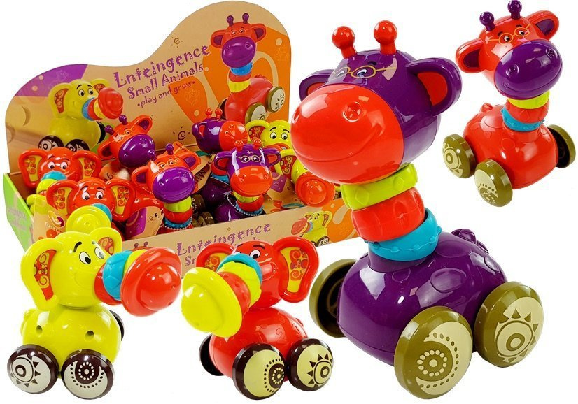 Bunte Tiere haben interessante Ablenkungen. Der Elefant an seinem Rüssel hält drei Gummiringe und hat am Ende einen Plastikhut. Der Hals der Giraffe ist ebenfalls mit roten, türkisfarbenen und grünen Gummiringen verziert. Der Elefantenrüssel und der Hals der Giraffe sind auf einem Gummi befestigt, damit wir sie dehnen können. Sie rasseln glücklich, wenn sie spielen.