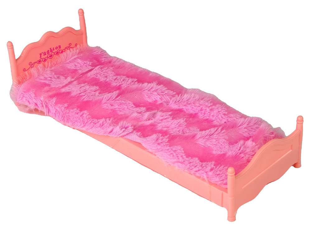 Außerdem gibt es einen professionellen Kleiderständer, der die Einrichtung ergänzen kann oder einen praktischen Nutzen hat - zum Aufhängen des Kleides. Ein Bett mit rosafarbener, pelziger Tagesdecke vervollständigt die Zimmereinrichtung im Puppenhaus.