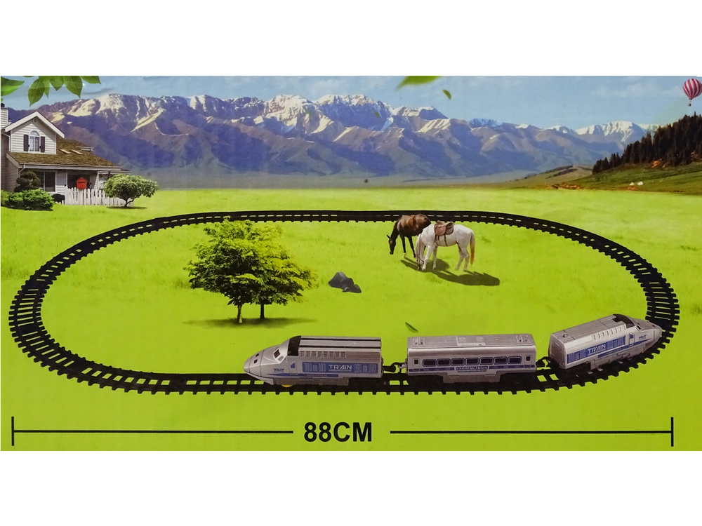 Das Set enthält einen Zug und zwei abnehmbare Waggons, Mitte und Heck. Darüber hinaus gibt es Bahngleise, auf denen Ihr Fahrer seinen Zug fahren kann. Sie haben eine sehr einfache Schließe mit Überlappung, 2 gerade und 12 halbrunde Bahnen, zusammen bilden sie ein Oval von 88 cm Länge. Der Vorteil ist, dass der Zug Geräusche eines fahrenden Zuges macht und eine rote Diode am Vorderwagen angebracht ist, was noch mehr Spaß beim Spaß macht.
