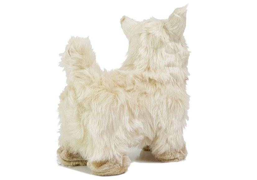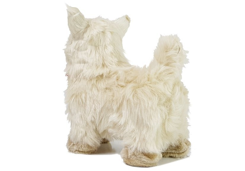 Der Hund hat cremefarbenes Fell, die Augenfarbe ist dunkelbraun, sogar schwarz, es fällt ins Auge. Es ahmt einen echten Hund dieser Rasse nach. Eine schöne rote Schleife um den Hals verleiht ihm zusätzlichen Charme.