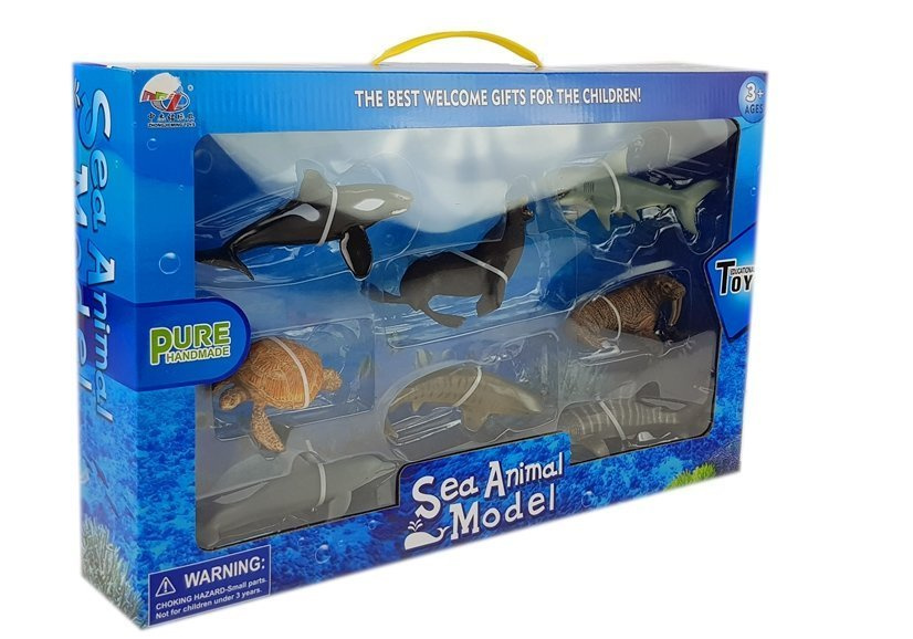 Zestaw złożony jest z 8 elementów, występują w nim: 3 rekiny, mors, foka, delfin, żółw oraz orka. Średnia długość figurek wynosi około 12 cm.