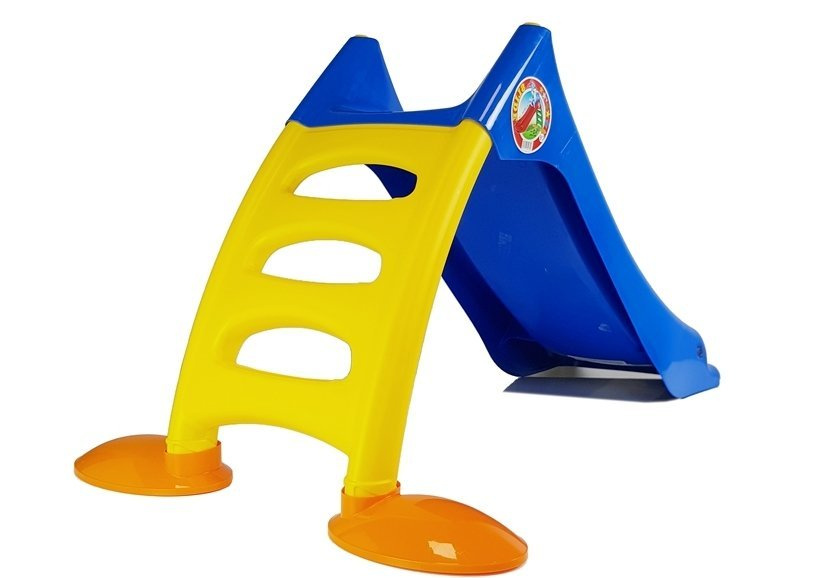 Sie können die Rutschen über eine dreistufige gelbe Leiter besteigen, und die Rutsche selbst ist blau. Die Höhe der gesamten Rutsche vom Boden beträgt 75 cm! Der Schlitten hat keine scharfen Kanten, er besteht aus hochwertigen Materialien und Kunststoffen. Neben der Leiter befinden sich orangefarbene Beine.