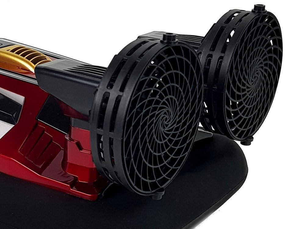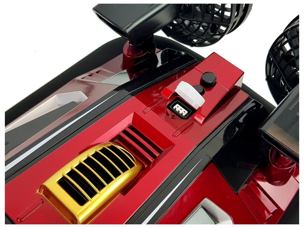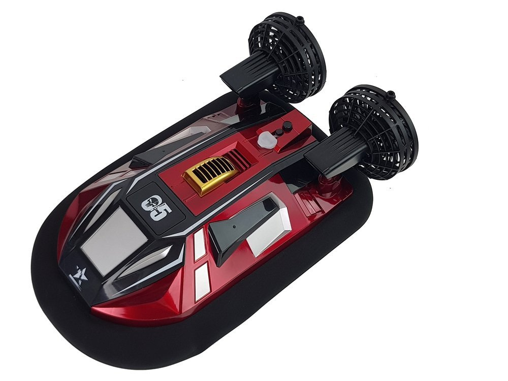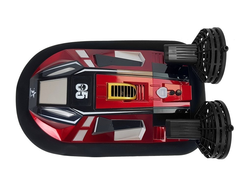 Das Fahrzeug kann sich ohne Propeller im Wasser oder ohne Räder an Land bewegen? Das verdankt es zwei großen Propellern, die die Luft mit solcher Kraft wegdrücken, dass das Hovercraft abhebt - das Funktionsprinzip ähnelt dem eines Düsentriebwerks, mit dem Unterschied, dass das ausgestoßene Gas Luft ist. Die gleitfähige Oberfläche ermöglicht es, sich auf glatten Flächen zu bewegen. Das lenkbare Hovercraft hat eine spezielle Konstruktion, die verhindert, dass Wasser ins Innere gelangt. Der Startknopf befindet sich auf dem Dach des Bootes. Das Aussehen, die stromlinienförmige Form des Motorbootes zieht die Aufmerksamkeit auf sich. Das Motorboot erreicht eine Geschwindigkeit von bis zu 20km/h. Es sendet auf der Frequenz von 2,4 GHhz. Die Fernsteuerung ist bequem, sie liegt perfekt in der Hand, sie kann vorwärts, rückwärts und seitwärts steuern.