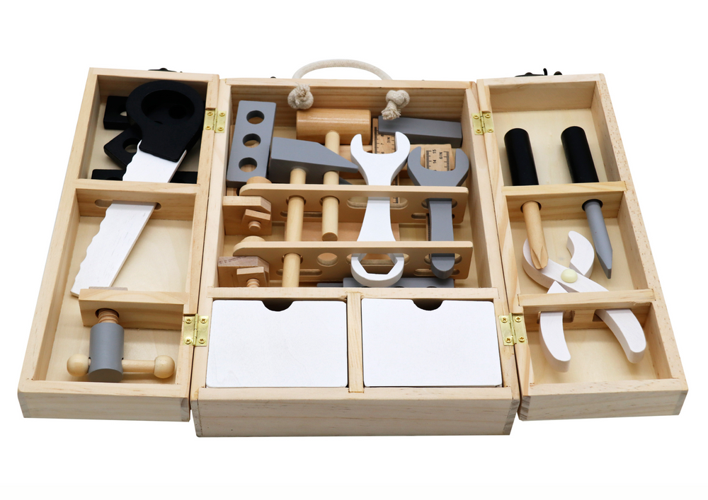 Das Spielzeug ist leicht zu transportieren und kann dank des Kordelgriffs auch an einem Ständer aufgehängt werden. Das klassische Holz und seine Langlebigkeit haben es schon immer sehr beliebt gemacht. Dieser Rohstoff sieht sowohl in seiner natürlichen Farbe als auch lackiert gut aus. In diesem Fall ist es in Grau, Schwarz und Weiß lackiert. Im Inneren des Kastens befinden sich passende Schubladen und Unterteilungen, so dass Ihre Werkzeuge geordnet und an ihrem Platz sind. Du kannst sie auch mitnehmen, um gemeinsam mit Gleichaltrigen Spielzeug zu reparieren oder zu zerlegen. Der gesamte Koffer ist mit Schnallen abschließbar.