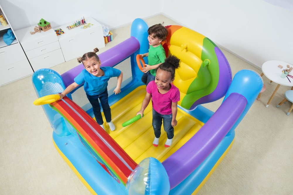 Dmuchany zamek to idealna rozrywka dla najmłodszych. Dzięki grubej nadmuchiwanej podstawie i nadmuchiwanym bokom z siatki, Twoje dzieci mogą skakać i bawić się w bezpiecznych warunkach. Solidna konstrukcja pozwala wytrzymać podskakiwanie, skakanie, toczenie i przewracania się. Przezroczyste ścianki pozwolą Ci kontrolować co dzieje się w środku i będziesz mógł cały czas mieć oko na malucha. Mały otwór znajdujący się w centralnej części dmuchańca ułatwia dzieciom wchodzenie i wychodzenie. Oprócz doskonałej zabawy maluchy będą mogły rozwijać zdolności motoryczne, koordynację wzrokowo-ruchową i zręczność. Dzieci uczą się świadomości przestrzennej, budują mięśnie i zyskują siłę podczas skakania i zabawy. Podczas zabawy na dmuchańcu dzieci mogą również rzucać dołączonymi do zestawu obręczami do specjalnych haczyków