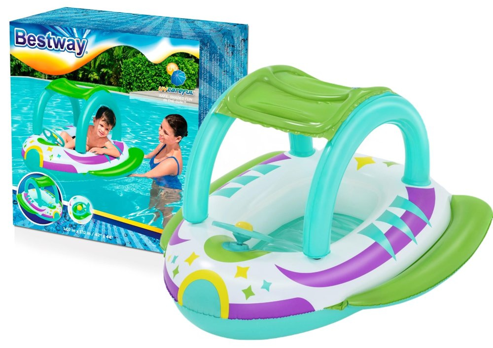 Jeżeli Twoje dziecko uwielbia spędzać czas w wodzie, bądź dopiero oswaja się z wodą, zaopatrz je w pontonik do pływania. Ponton jest lekki i poręczny po złożeniu nie zajmuje dużo miejsca przez co z łatwością będzie można go przetransportować. Ciekawe kolory dodatkowo zachęcą Twoje dziecko do zabawy w wodzie. Ponton przeznaczony jest dla dzieci w wieku od 3 roku życia. Dodatkowy atutem jest dmuchane dno oraz daszek, które zapewnią, że maluch będzie czuł się komfortowo. Wbudowana kierownica z klaksonem zapewni dodatkową atrakcje. Łódka wykonana jest z wytrzymałego winylu odpornego na uszkodzenia.