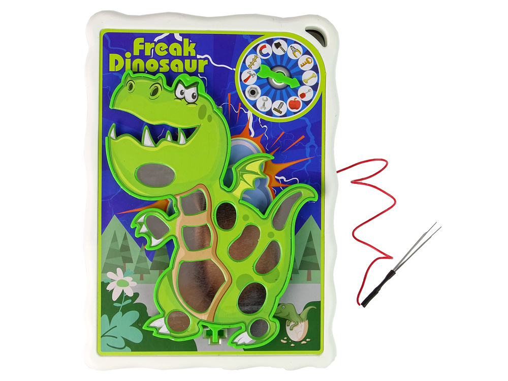 Na planszy znajduje 12 różnych miejsc na ciele dinozaura na którym należy położyć małe elementy/ narzędzia. Zakręć kołem, sprawdź co wskaże strzałka. Dany przedmiot spróbuj ostrożnie wyciągnąć z danej części. Ale uważaj! Wystarczy, że lekko dotkniesz powierzchni dinozaura, a on zadrży, zacznie brzęczeć i przegrywasz. Spróbuj go nie obudzić.
