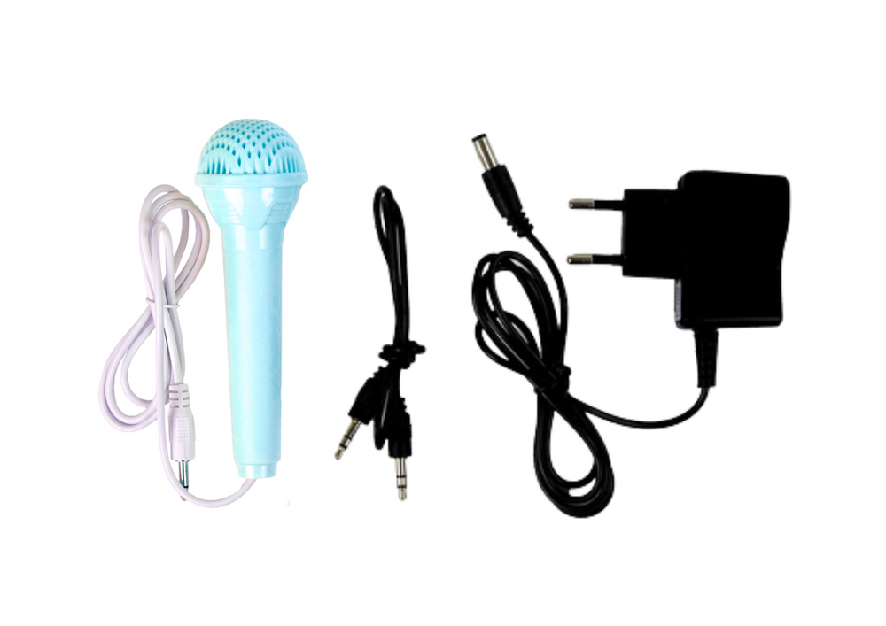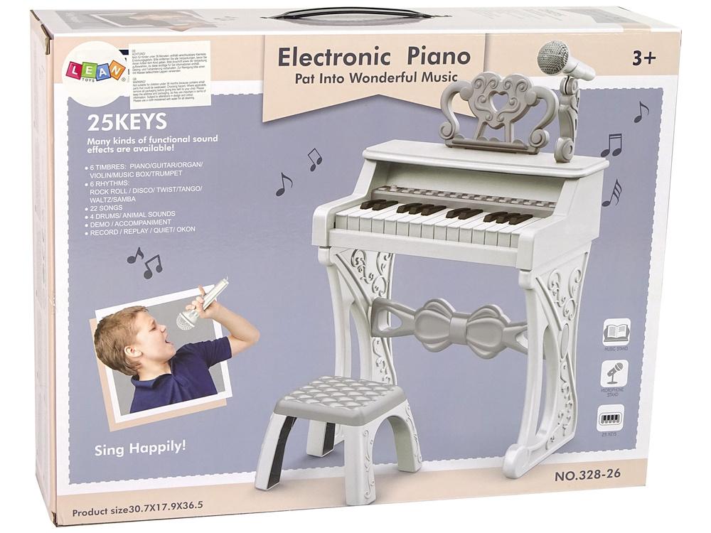W zestawie znajduje się keyboard ze statywem i krzesełkiem w kolorze niebieskim z pięknymi wzorami. Maluch może wygodnie zasiąść i rozpocząć swój koncert. Keyboard posiada 15 klawiszy białych i 10 czarnych. Dodatkowo w zestawie dołączony jest mikrofon z mocowaniem, dzięki któremu maluch będzie mógł jednocześnie śpiewać i grać. Zewnętrzne gniazdo wejściowe pozwala na słuchanie ulubionych piosenek. Idealna okazja do zorganizowania karaoke w domu i pierwszych występów przed ludźmi.