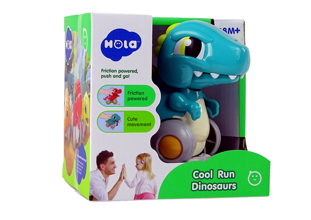 Figurka przedstawia uroczego zielonego dinozaura z jasnozielonymi grzebieniami. Wystarczy docisnąć dinusia do podłoża, puścić i podziwiać jak mknie w przód. Bez problemu porusza się po płaskich powierzchniach, zatrzymuje się na przeszkodach. Dziecko chcąc dogonić dinozaura, chętniej będzie się poruszać i stawiać pierwsze kroki. Dinozaur podczas jazdy otwiera i zamyka buzię.
