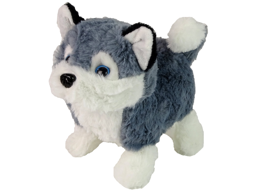 Biało - szary puchowy piesek sprawia, że nie można oderwać od niego wzroku. Husky spaceruje, macha ogonkiem podczas stania, zachowuje się jak szczęśliwy piesek. Otwiera pyszczek i wydaje odgłosy piszczenia. Możesz wziąć swojego małego pluszowego przyjaciela na spacer, a zauważysz, jak będzie merdać ogonkiem ze szczęścia. Idealny mały przyjaciel Twojego dziecka.