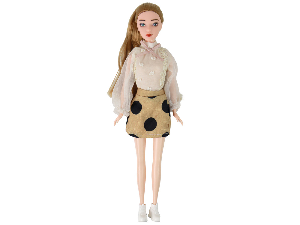 Lalka Emily to urocza zabawka z długimi, uczesanymi w kucyk blond włosami . Ma zielone oczy i elegancką stylizację: białą koszulę z różową kokardą, brązową spódnicę w czarne grochy oraz białe sportowe buty. W zestawie znajdują się również czarne okulary i biała gitara z różowym zdobieniem. Wymiary gitary wynoszą 17 cm x 6 cm. Emily to idealna towarzyszka dla małych miłośników muzyki i mody.