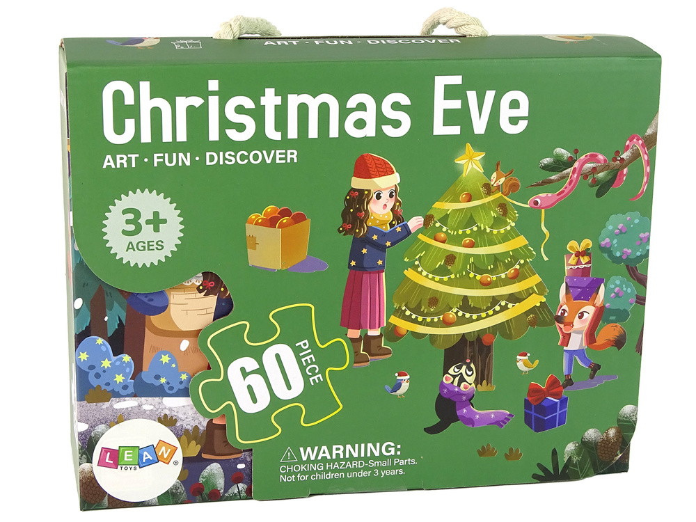Układanka jest kolorowa, żywa i zachęca do zabawy. Obrazek przedstawia czas przygotowań świątecznych, na którym można zobaczyć, przystrajanie choinki dekoracjami świątecznymi. Pokazane w przyjazny sposób zachęcą do zabawy oraz nauki nazw zwierząt.