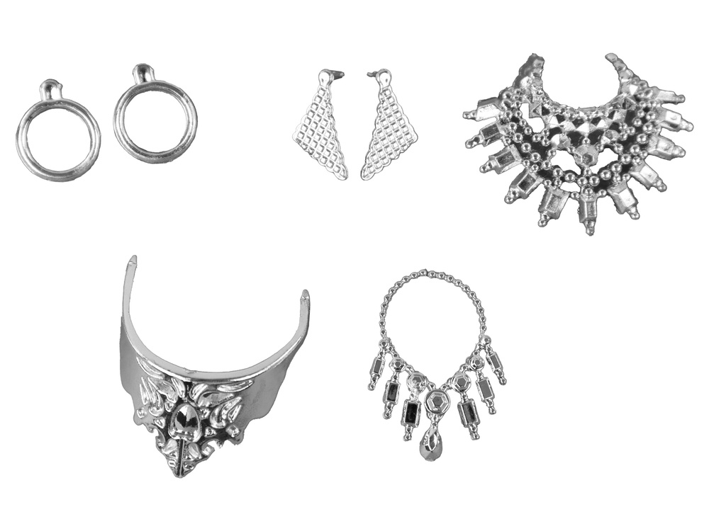 To nie wszystko! Zestaw zawiera także elegancką białą szafę z 12 parami butów na zmianę na obcasie. Lalka ma do dyspozycji aż 5 różnych sukienek wieczorowych, w tym białą, fioletową, ciemnoróżową, niebieską i jasnoróżową, z tiulowymi dodatkami i brokatowymi zdobieniami. Dodatkowo, zestaw jest bogaty w akcesoria, takie jak 2 pary srebrnych kolczyków, 2 torebki (fioletowa i złota), 3 naszyjniki, spinka do włosów i szczotka do włosów.